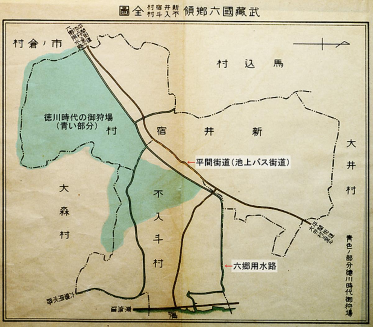 大井町の歴史-11 「大井町の隣にあった不入斗(いりやまず)村」|Life Protopia (k-protopia.com) 中 「武藏国六郷領新井宿村/不入村全圖」によれば、平間街道(現・池上通)から東側の水利は六郷用水に拠っており、明治9年以降、品川用水に拠ることになったのは西側の地域だったことがわかる